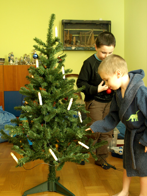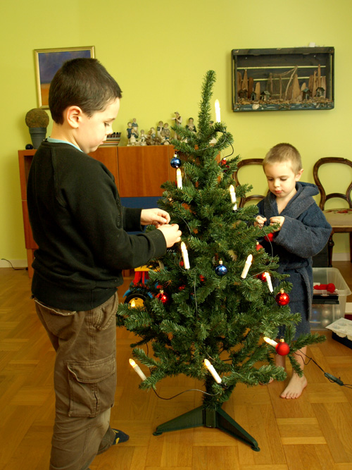 idag var det dags att klä granen. i år har linus och noah fått klä den alldeles själva, precis som dem själva ville. jag tycker dem har lyckats få den jättefin även om det är många saker på vissa ställen. det är så det ska vara när barnen gör det.