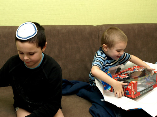 äntligen var det chanukka igen. killarna har väntat ett tag men idag var det äntligen dags. noah ville inte vara med och tända ljusen men linus skötte det bra. i paketen till bådas glädje var det indiana jones-lego till linus och transformers till noah.