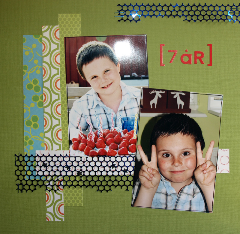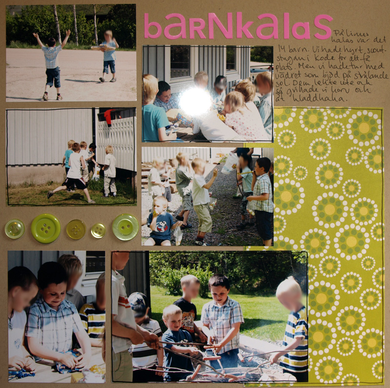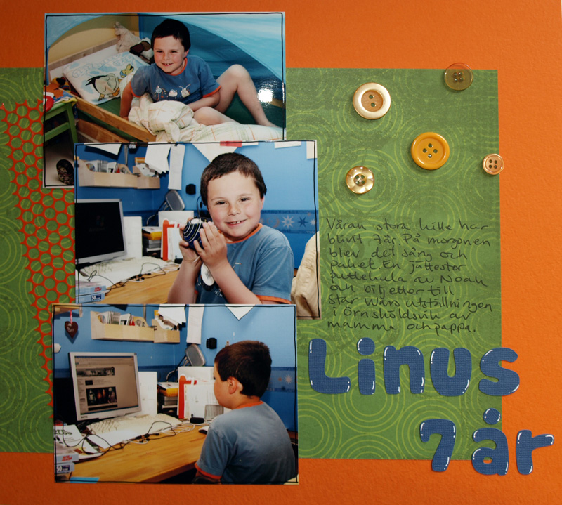 än så länge går det bra med scrappandet här på landet. jag kom fram till att jag behöver göra två layouter varje dag och än så länge har jag fått gjort det. skönt att få scrappat lite. här kommer några lite äldre från när linus fyllde år i maj.